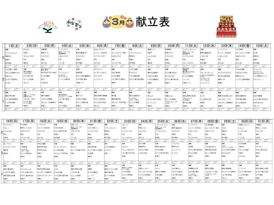 令和7年3月1日㈯ 3月の予定表&給食献立表